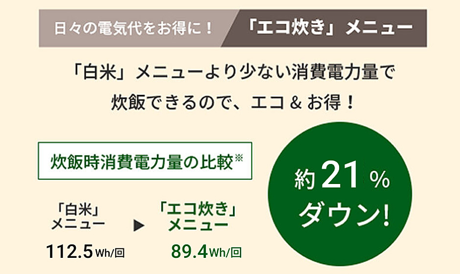 *White Rice and Eco were compared by cooking 2 go of rice with each setting. Tested at a room temperature of 23°C and water temperature of 23°C. Results will vary depending on the kind of rice, room temperature and water temperature. (Based on company research)