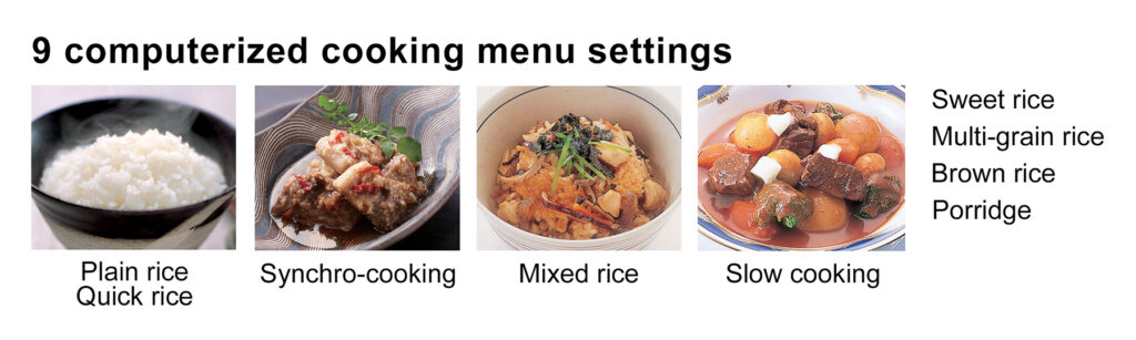 “Rice,” “Synchro Cooking,” “Steaming,” and “Slow Cooking” can all be done in one machine. 4 in 1