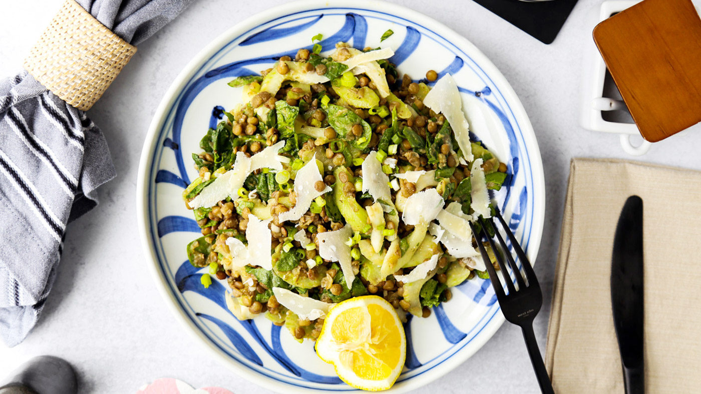 We’re using green lentils in this salad because of their robust, almost peppery flavor profile. They compliment the natural verdant freshness of the baby spinach, scallions and celery used in the recipe.