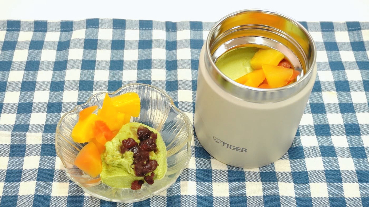 入れる直前にフードジャーの氷水を捨て、6を半分流し入れ、凍らせたゆであずきを入れ、上から残りの6をすべて入れる。