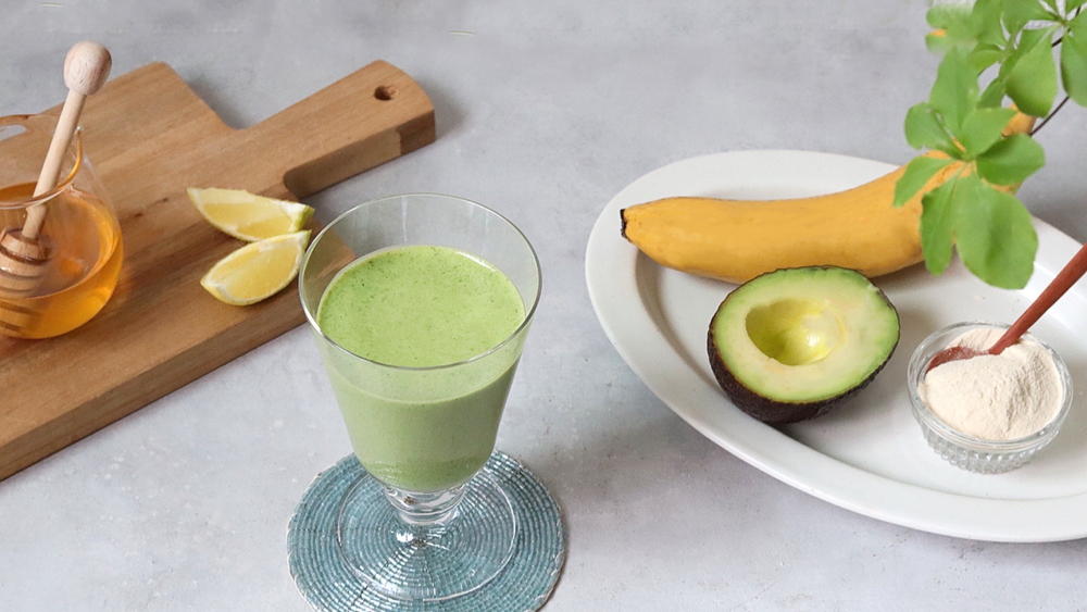 牛乳→プロテイン→はちみつ→レモン汁→バナナ→サラダほうれん草→アボカドの順にカップに入れ、「Powerful(パワフル)」で約1分かくはんする。