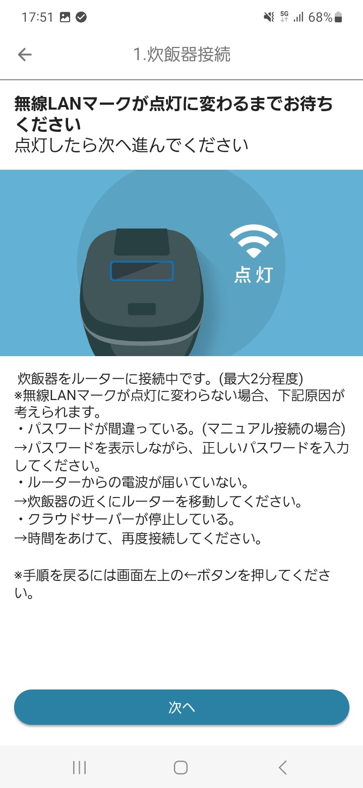 - ※2分以内に㉟までを完了できなかった場合(専用アプリへ登録コードを入力し、[炊飯|無洗米]を押さなかった場合)登録コードが無効になります。無効になった場合は、再度⑲からはじめてください。