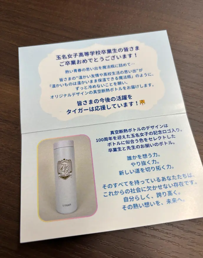 「卒業生たちに何かできないかといろいろ調べていたところ、炊飯器やボトルで有名なタイガー魔法瓶さんが行っている『#青春を冷ますな!魔法瓶キャンペーン』のことを知り、皆さんに内緒で応募しました。当選するのは1校だけなのですが、なんと!この度、玉名女子高等学校が選ばれました!」