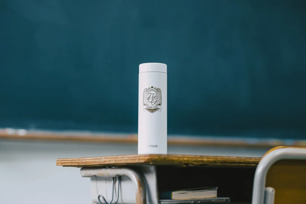 ボトルのカラーは白色にし、ロゴはボトルの色に合うように金色にしています。どちらのカラーも少し落ち着いた色味にしており、「学生の間だけでなく、職場に持っていっても風景になじむようにしたい」「学校で過ごした思い出とともに長く使ってほしい」という想いを込めて、先生の皆様が一生懸命考えたカラーリングになっています。