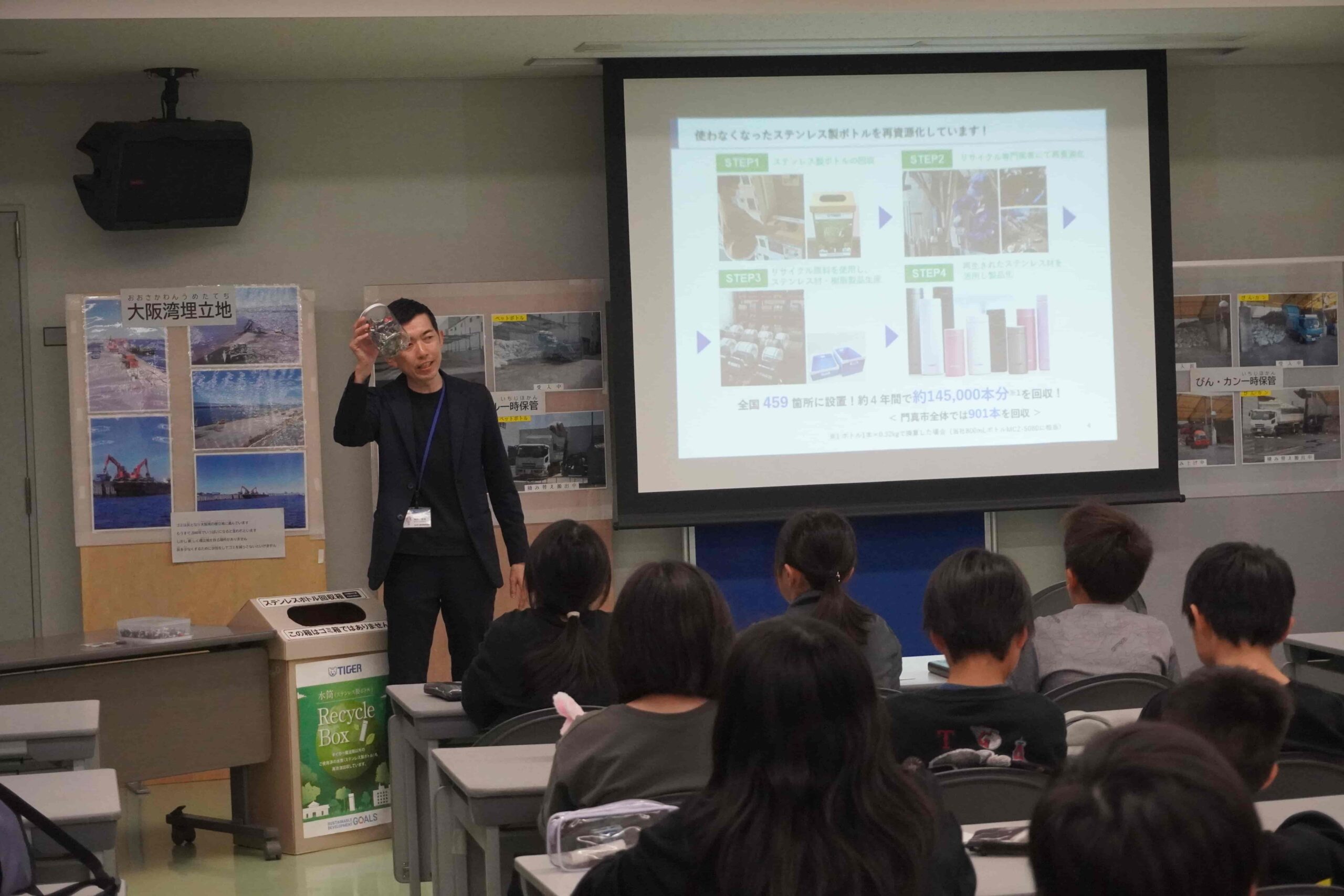 この特別出張授業は、24年度よりタイガー魔法瓶が立ち上げた「タイガー魔法瓶 マイボトルでSDGsプロジェクト for School 」の一環で、将来を担う子どもたちに身近なマイボトルの使用やボトルリサイクル活動を通じて、地球環境や温暖化について考えることを目的に、取り組みを行っております。