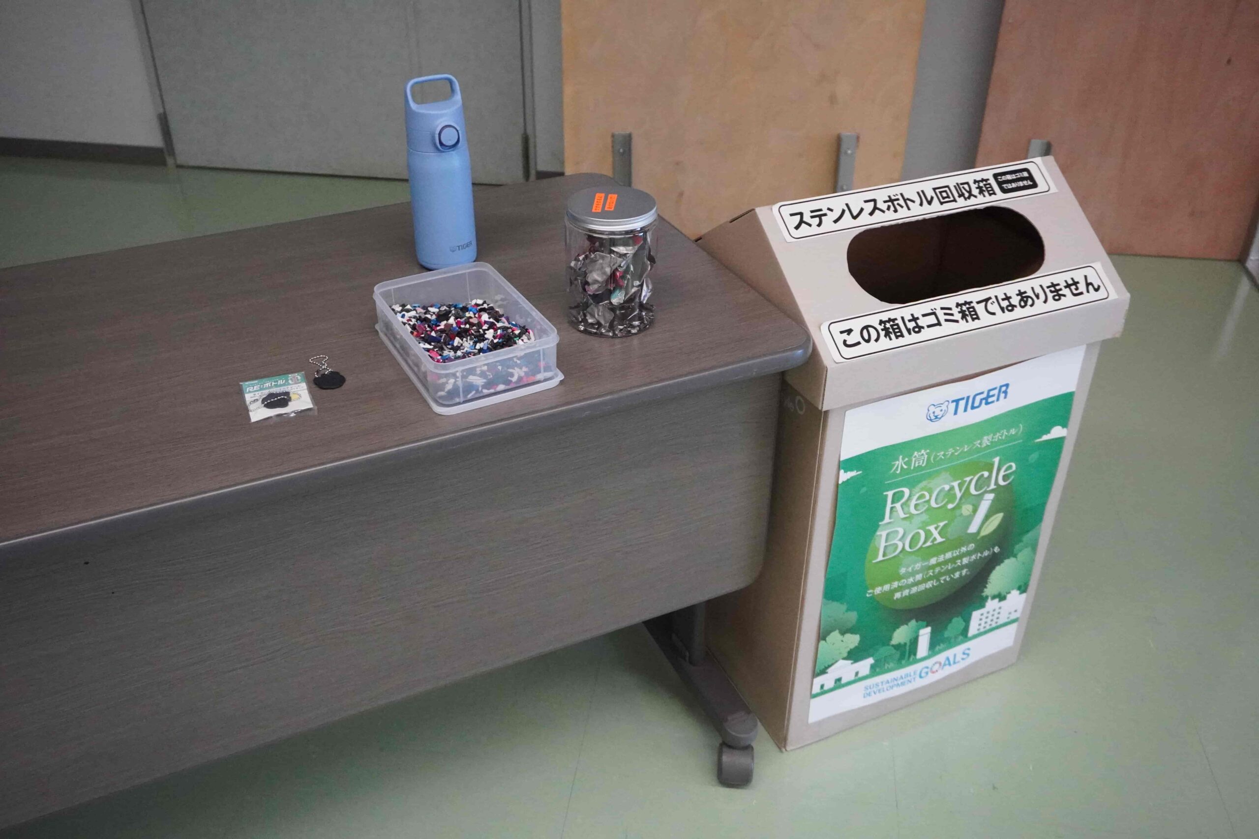 当社では使用済みのステンレス製ボトルの回収ボックスを全国493カ所以上に設置しております。ステンレスを素材とするボトルをまとめて回収することで、リサイクル効率をあげて、純度の高いステンレス原料が確保できることを説明。子どもたちが暮らす門真市におけるステンレス製ボトルの回収ボックスの設置場所を紹介し、不要になったマイボトル再資源化を呼びかけました。