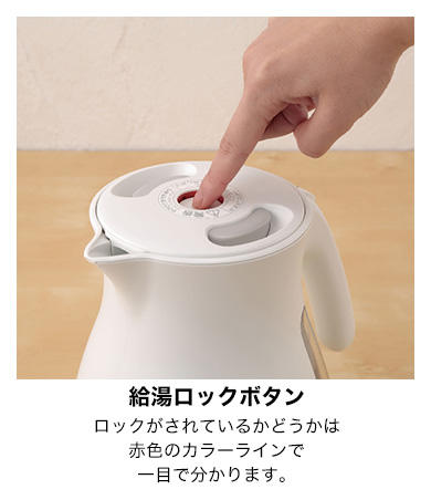 注がない時はもう一度押してロックしておけば、万一倒れても注ぎ口からのお湯もれをおさえます。