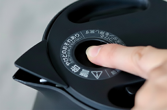 ロックしておけば、万一倒れても注ぎ口からのお湯もれをおさえます。注ぐときはボタンを押して片手でらくらく操作。