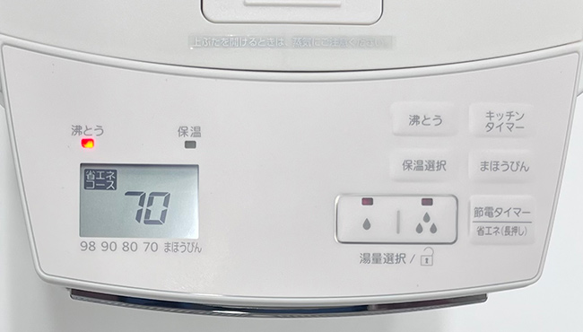 お好みの湯温(98・90・80・70)に設定でき、設定される保温温度になると湯沸かしが終了します。