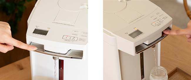 通電時は指一本で注げる電動給湯、電源のない場所では、プラグを外していても注げるエアー給湯でお湯が注げます。