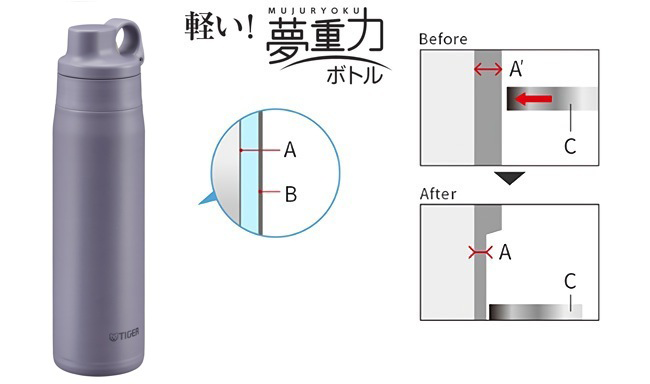 当社独自のスピニング加工により、ボトル内筒を薄く加工(約0.08mm)し、軽量化を実現。
