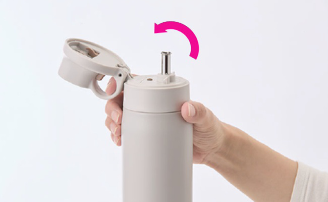 ふたの開閉部は片手で開けやすい設計の「ループせん」を採用。ボタンを押すとロックが解除され、そのままループを指で支えてふたを開ける仕組みになっています。事務仕事をする際やアウトドアのときでもらくに水分補給がおこなえます。