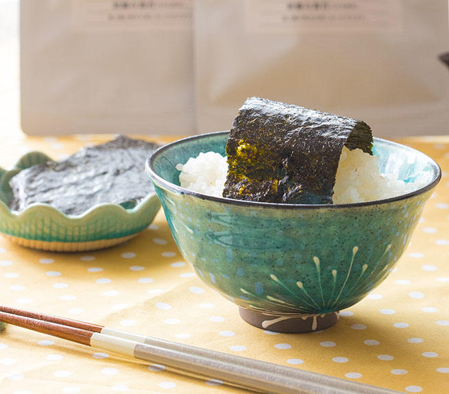 初摘みの佐賀海苔とこだわりの「石垣の塩」で作られた「塩のり」。 控えめな塩味が海苔の味をより引き立て、白ごはんに巻いて食べると、口のなかに海苔の香りが広がります。のり一枚一枚にとても厚みがあり、食べ応えも十分なお品です。