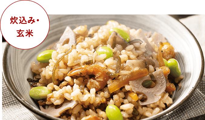 麦めし、雑穀米、玄米を炊込みにしておいしく食べられる3メニューを搭載。麦めしや雑穀米、玄米にチャレンジしたいけれどちょっと苦手な人でも炊込みにしておいしく無理なく食べていただけます。また炊込みに入れる具材で栄養素(食物繊維、鉄分など)も補充できます。