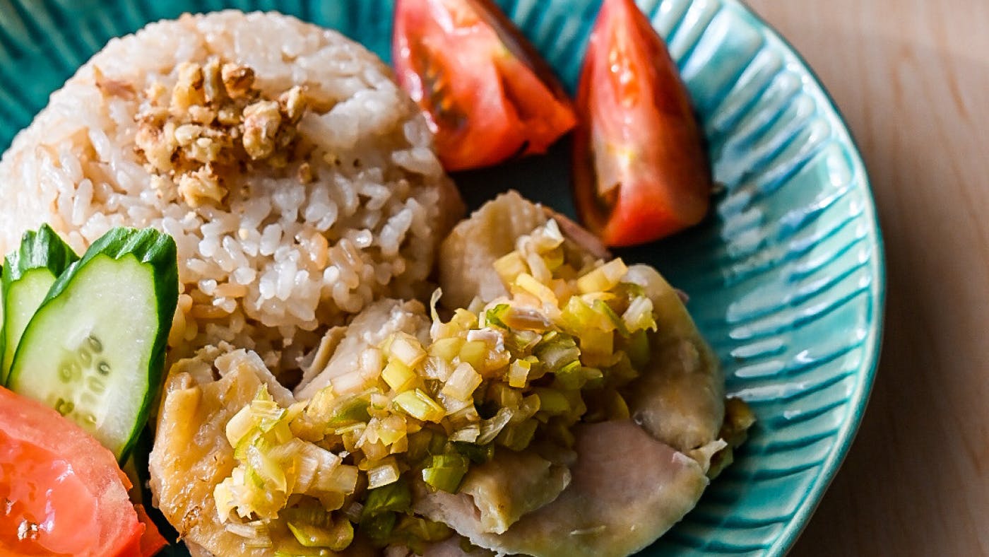 烹饪完成后,确认压力指示针已回落。按下压力按钮使其降下,随后打开锅盖。去除葱绿部分,将鸡肉切成适口大小。将米饭拌松后盛入碗中。