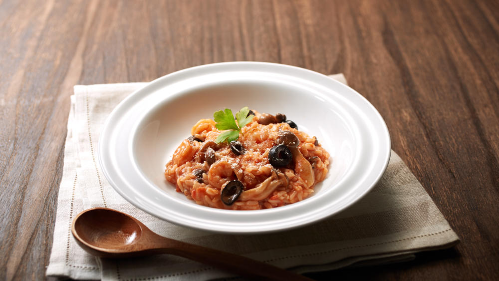 将米、切丝的蟹味菇、番茄酱、高汤粉和水放入内锅。充分搅拌后,将内锅放入主机并盖上锅盖。